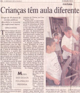 Oficinas para a Família é destaque no Jornal Notícias Santana, que mobilizou pais, mães e filhos a confeccionarem uma pipa para sua família. Uma atividade de integração e também os pais puderam relembrar momentos de sua infância ao brincar de pipa. Ago/2.001 |